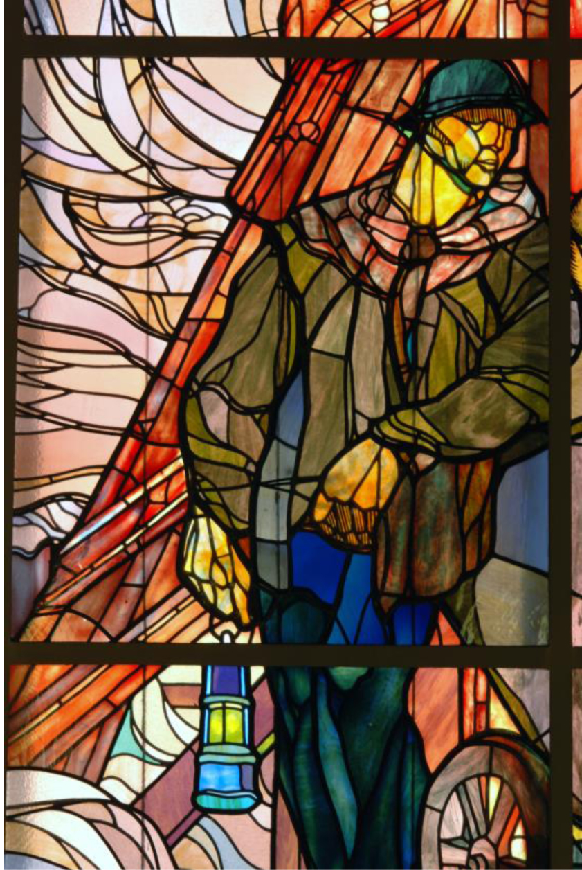 Détail du vitrail de la Faculté Polytechnique de Mons dessiné par Anto Carte, primitivement situé dans le charbonnage d’Hensies-Pommeroeul. Photo V. Vincke