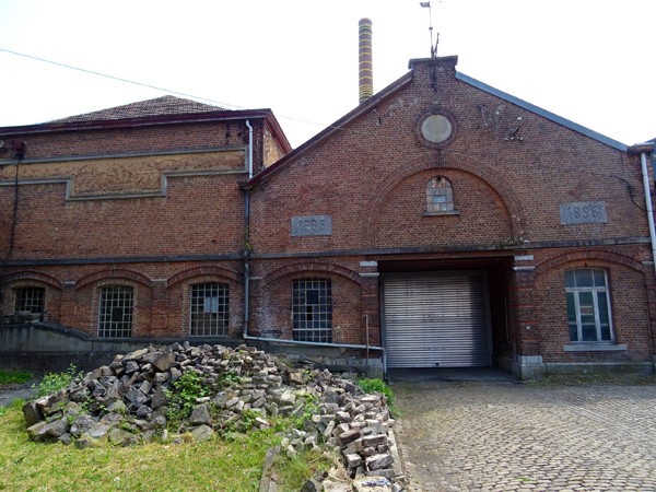 Zone 3 : La façade vers les voies ferrées présente les traces d’anciennes baies, antérieures au rehaussement de la rue de la station. La structure des étages est formée d’un ensemble de colonnes en fonte dont les chapiteaux sont de facture intéressante. Des poutres métalliques supportent des voussettes en briques ou en béton. L’extrémité de la zone est délimitée par la cheminée dont le regard pour l’évacuation des cendres est toujours présent. Dans cet espace ont été érigés une série de garages construits en blocs de béton. Ils dénaturent la lisibilité de l’espace.