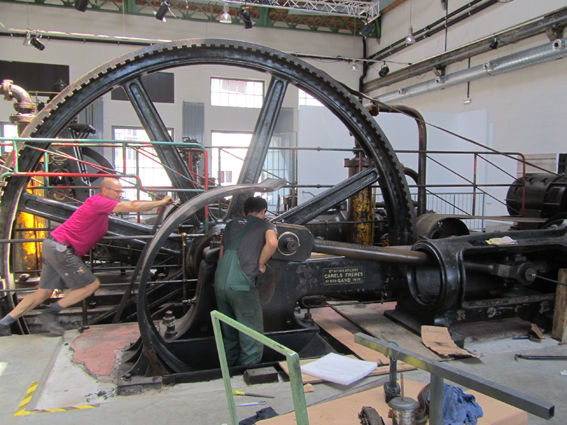 La Carels voulait bien tourner mais il a fallu le lui réapprendre. Notre équipe est parvenue à débloquer les pistons de la machine suite à plusieurs essais laborieux où le génie de nos mécaniciens a été mis à contribution, tant l’état des cylindres était catastrophique après 60 ans d’immobilité et dix ans d’infiltrations d’eau. Aujourd’hui, c’est époustouflant de pouvoir faire tourner ce volant de cinq mètres de diamètre et de cinq tonnes, tout en entraînant les pistons de la Sulzer, à un seul homme tirant sur le « racagnac »qui servait jadis à mettre le moteur au point zéro pour recevoir la vapeur. Suite à ce succès, la Carels et la Sulzer ont eu droit au même traitement que les machines précédentes, avec un nettoyage en profondeur mais tout en douceur, ainsi que l’application du vernis protecteur spécial antirouille. L’ancienne courroie qui était placée sur le volant afin de le mouvoir à l’aide d’un moteur électrique dans les années 1955, après l’abandon de la vapeur, a été replacée. Elle avait été conservée aux dépôts de La Fonderie.