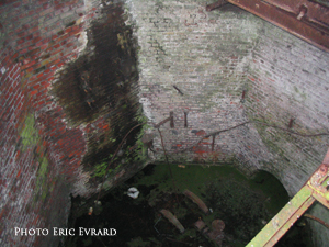 A l'intérieur, subsiste toujours, mais en mauvais état, la rambarde qui surplombe le puits proprement dit, ce dernier étant cuvelé de briques. La nappe aquifère se trouve à quelques mètres du niveau du sol. On distingue latéralement une galerie voûtée qui semble prendre la direction des installations de la fosse, vers le sud, et par lequel s'évacue l'eau jaillissant en petite quantité. On distingue encore une voûte en maçonnerie et l’ébauche d’une autre galerie dans la direction du coron, vers l’est. Enfin, noyée dans cette eau, reste une pompe avec ses tuyauteries et ses deux volants d'inertie.