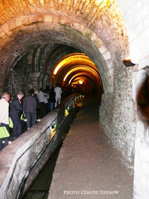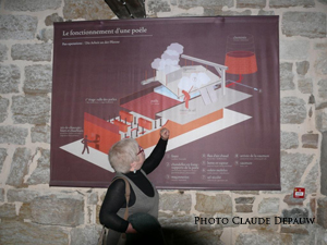 La visite des Salines a débuté par la descente dans les monumentales galeries souterraines et leurs extraordinaires voûtes médiévales en plein cintre (13e s.) que les participants au colloque ont parcouru sous la conduite de M. Yann Garnache, directeur des Salines et de l’Office du Tourisme. Certaines de ces galeries doivent encore faire l’objet de fouilles car elles sont remplies jusqu’à la moitié de leur hauteur originelle des cendrées provenant des chaudières des poêles. D’autres abritent encore deux puits, chacun pourvu à l’origine de plusieurs sources. Un système de pompage hydraulique datant de 1848 et toujours en fonctionnement puise à près de 250 mètres de profondeur une saumure chargée de 330 grammes de sel par litre. Ce n’est qu’au 18e s. que la force hydraulique a été adoptée pour actionner les pompes destinées à élever la saumure jusqu’à la surface. Auparavant, des norias mues par des moulins à chevaux élevaient la saumure d’un étage à l’autre.