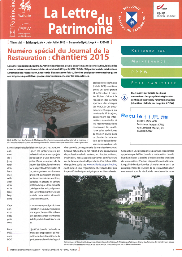Un numéro spécial de « La Lettre du Patrimoine » publiée par l’Institut du Patrimoine Wallon (IPW) vient de paraître.